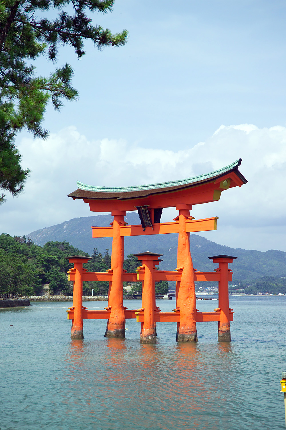 Pulau Miyajima, Prefektur Hiroshima, Jepang.Kuil ini terkenal karena gerbangnya yang dramatis, atau torii, di pinggiran kuil, puncak-puncak suci Gunung Misen, hutan yang luas, dan pemandangan lautnya